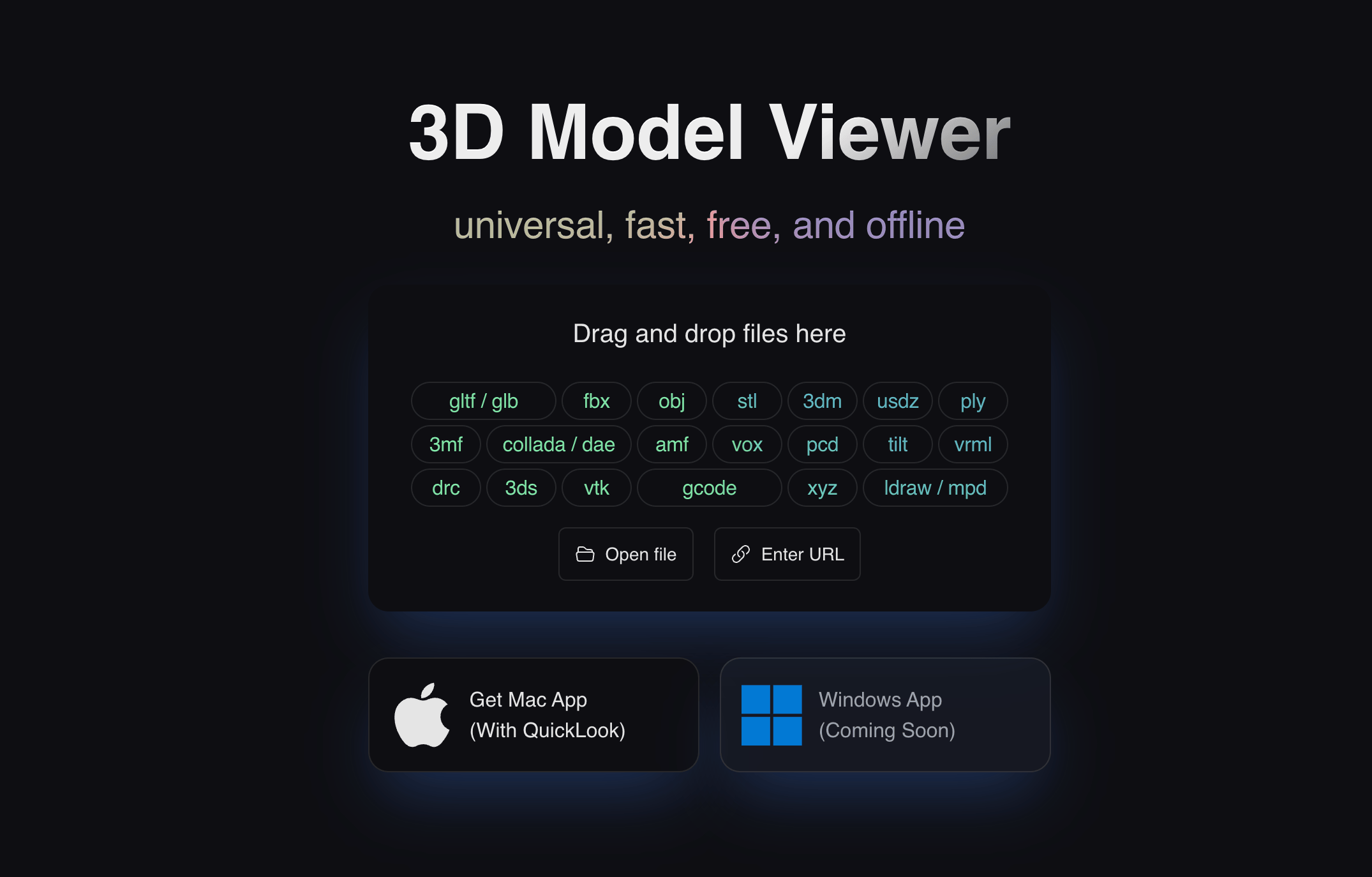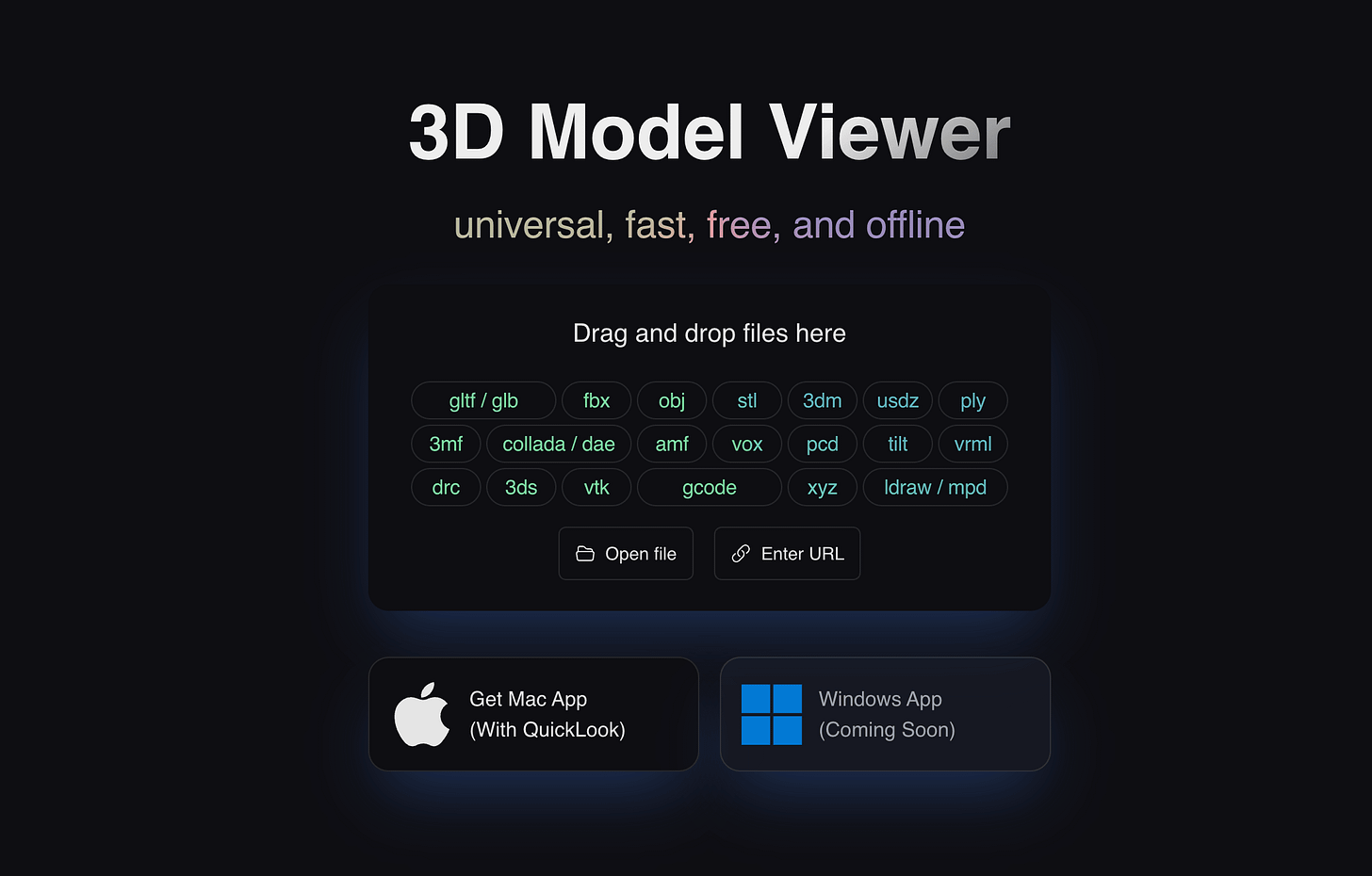 如果你日常大部分的场景都是简单查看这些 3D 模型,那么 3D Model Viewer 可能会是你的好帮手。这个工具在线即可直接查看众多格式的 3D 模型。如果你下载了它的 Mac App,还可以获得 QuickLook 的支持。
