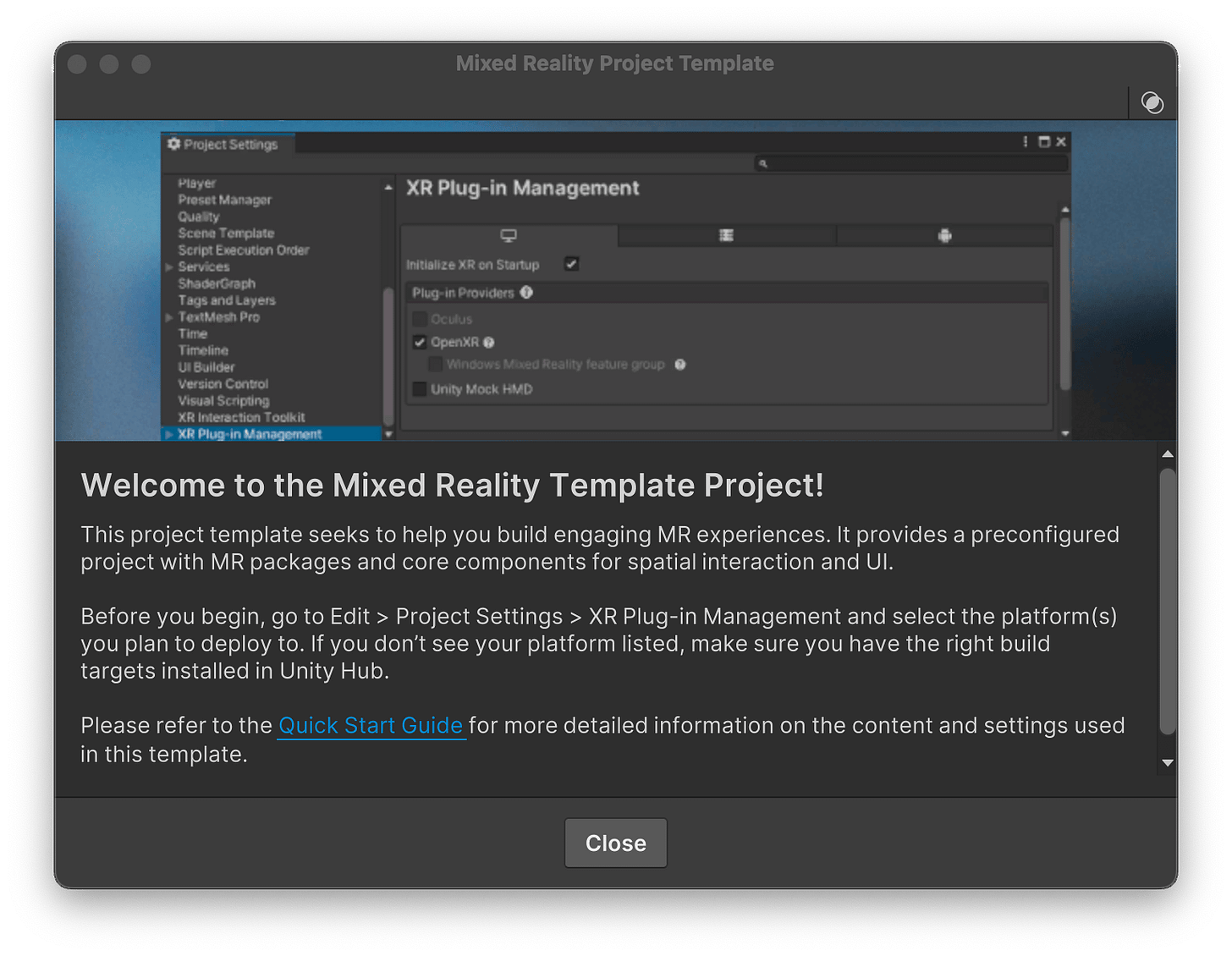 其次,Unity 提供了全新的 Mixed Reality Template 方便开发者快速开始一个 MR 工程