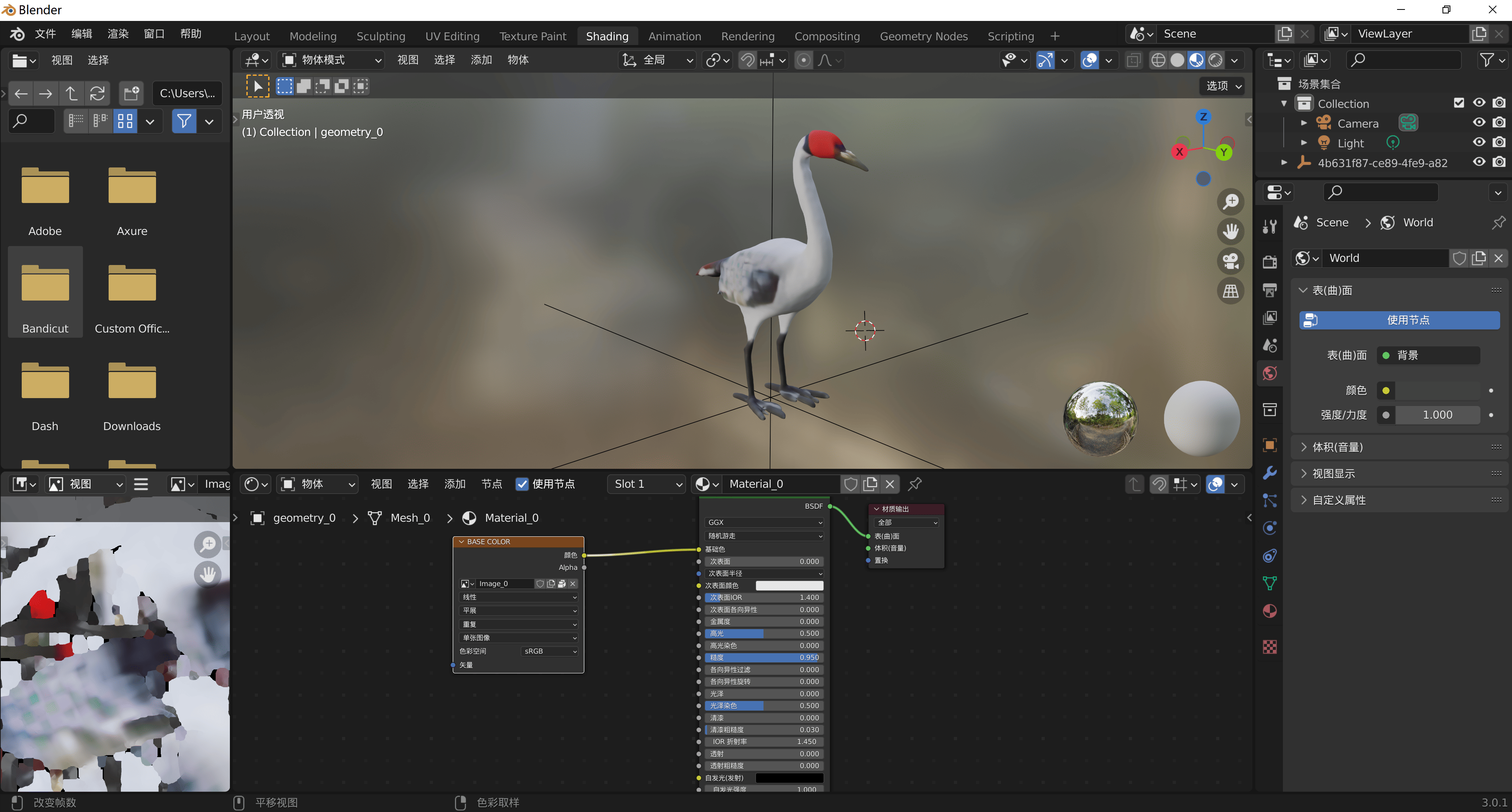 选中生成好、满意的模型对应的链接后,可以跳转到官网进行下载(其实可以同时看到这个提示语对应的 4 个模型)。模型还自带材质,分为“默认”、“塑料”、“金属”、及“客制化”(光泽、粗糙度、颜色)可以选择。下载后为 glb 格式,可以用 3D 编辑软件如 Blender 打开,这里我们看到材质本身也是自带贴图的,方便做进一步调整。