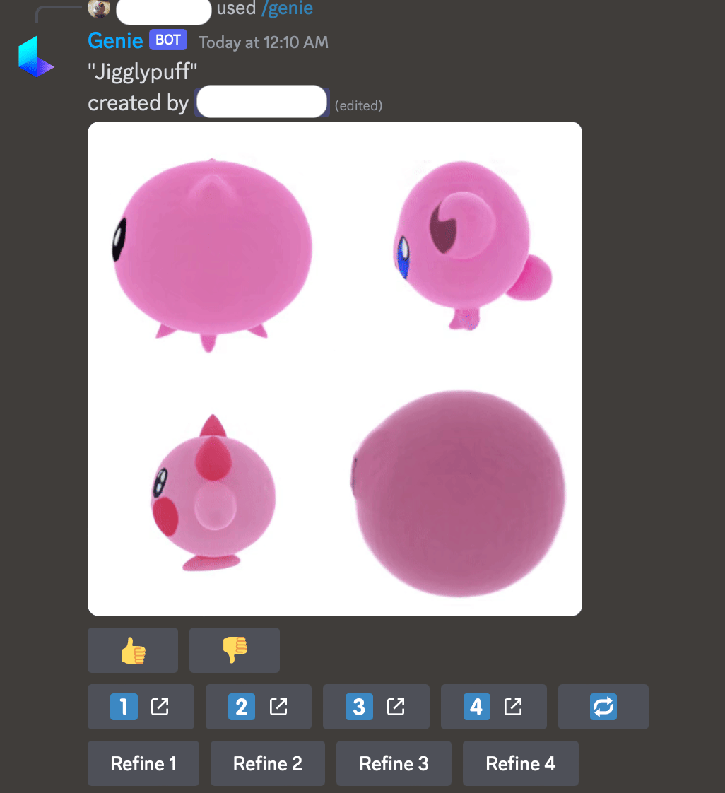 整体使用方式与体验很像同样搭载在 Discord 上的“文生图”模型 MidJourney ,Bot 会针对文字描述一次给出 4 个模型,用户可以对于 3D 模型 生成质量给出评判从而帮助开发者更好地优化模型服务。也可以点击不同模型对应的链接 tab 来打开、下载分别的模型,不满意也可以使用同一提示语重新生成,还可以针对某个特定模型微调。