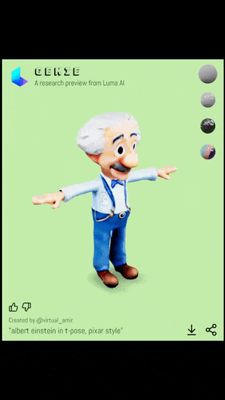 用例上,除了可以节省美术同事的工作时间、提升效率以外,X 网友 Amir 还提出并自制了一个 demo ,他提到自己先使用 Genie 生成了爱因斯坦的 3D 模型,再用 Adobe Mixamo 制作动画并用 8thwall 实现 AR 体验,最终通过 Meta Quest 3 的透视功能预览这个模型。更进一步,他提出如果后续可以接入 OpenAI API,就可以快速实现与类似 Character.AI 上创造的角色有化身的、更具象的对话。