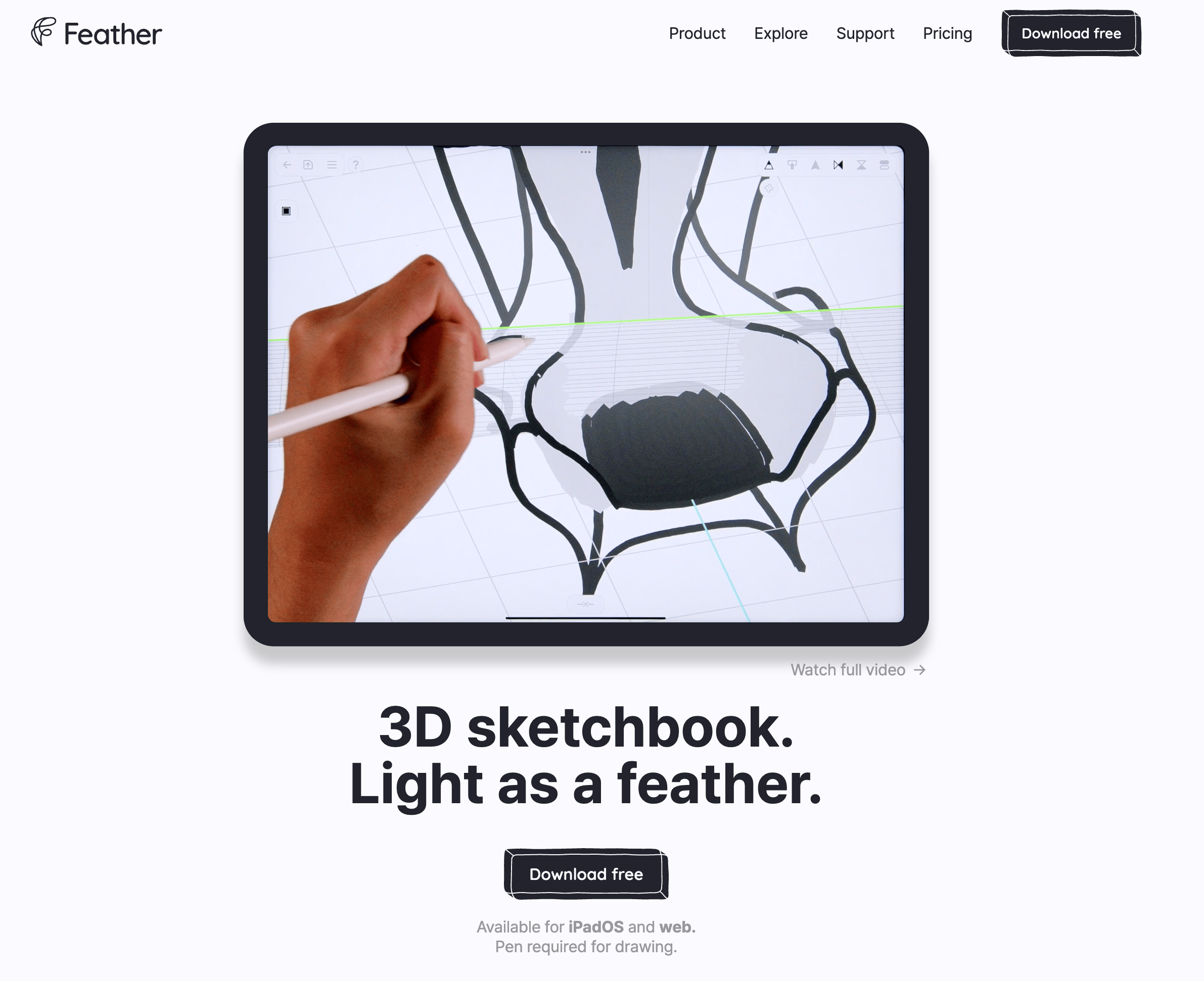 在这个问题上,Feather 这个 App 给出了一种可能得解法。在 Feather 这款专注于 3D 手绘的产品中,你需要先使用画笔描绘出来一个“参考面”,然后接下来,你就可以在这个“参考面”上像使用普通的画笔进行绘制。这一点在 官方的一个例子 中展示的比较直观: