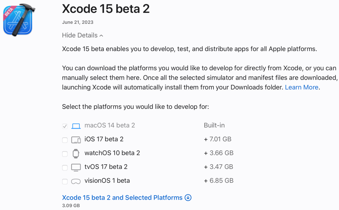 Vision Pro 的 SDK 和模拟器都包含在 Xcode 15 beta 2 中,但是为了快速下载,建议在下载页取消选中 iOS17 和 visionOS1 的 SDK,安装 Xcode 后可以再单独下载。