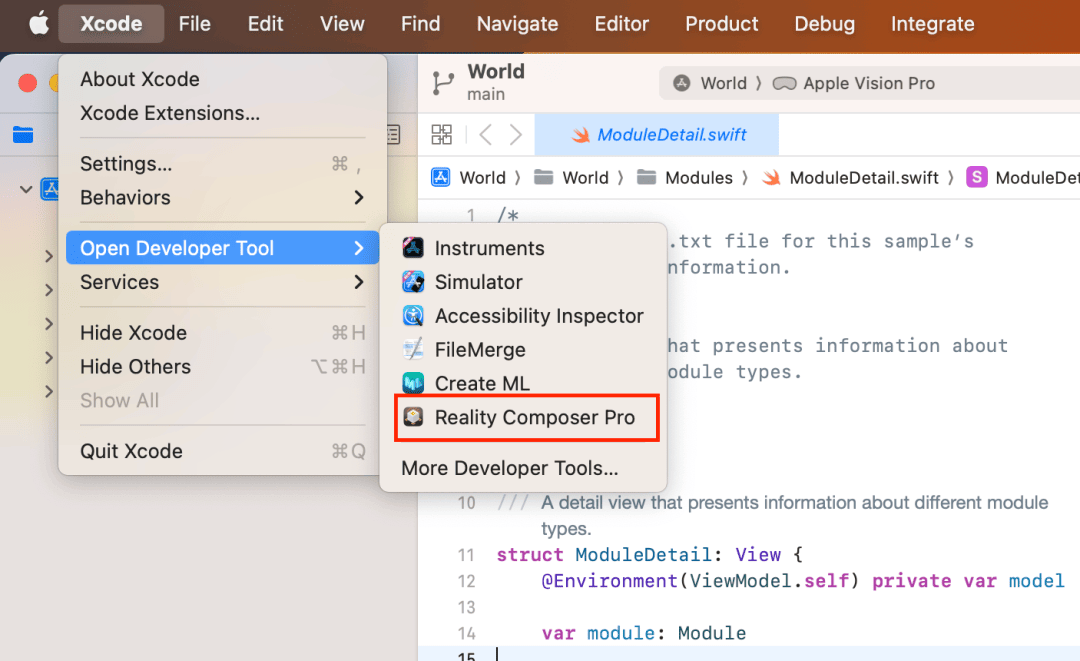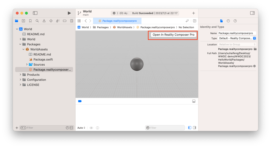 如果已经打开的 Xcode 项目中包含 Reality Composer Pro 文件的话,也可以从 Xcode 窗口中打开。比如,在苹果的 Demo 工程 World 中: