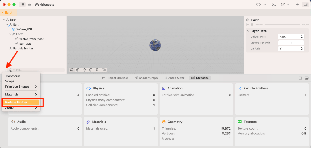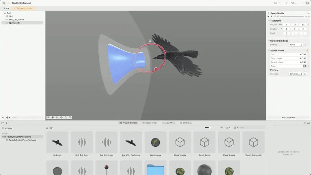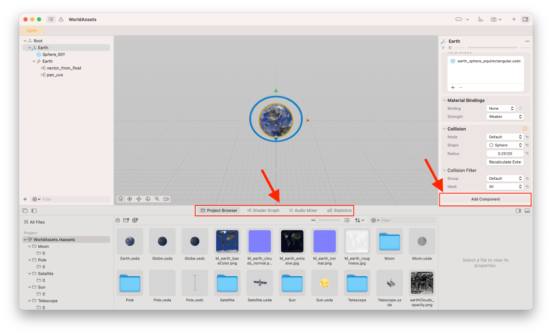 新的 Reality Composer Pro 界面和功能也发生了一定的变化,整体有点像 Unity 编辑器的界面了。最主要体现在下方的工作区多了 4 个标签:项目浏览器、Shader Graph、Audio Mixer、统计。同时右侧也多了“Add Component”按钮,可以添加额外的 Component,包括使用 Xcode 编写的自定义 Component。
