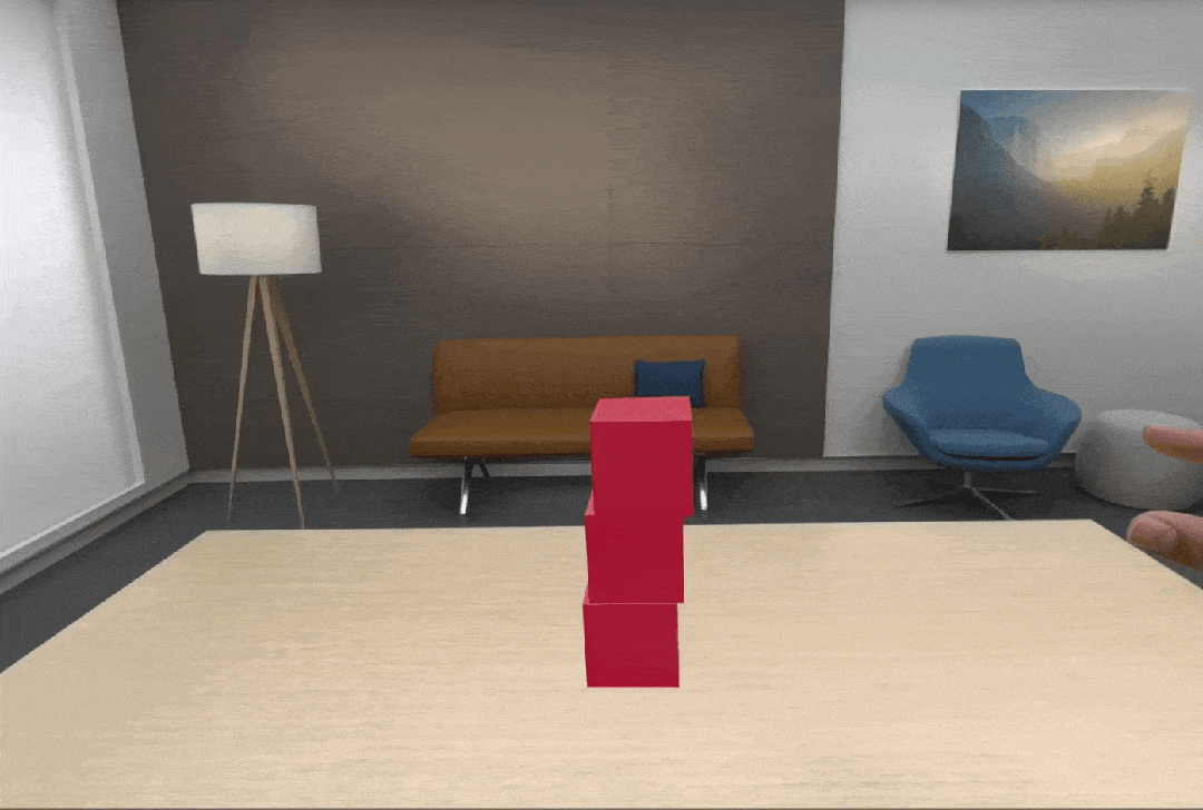 第三,当一个应用运行在 full space 模式的时候,开发者还可以借助 ARKit 的手部骨骼跟踪功能,开发属于自己的交互手势。例如下面这个图里,可以通过单手横扫摧毁方块: