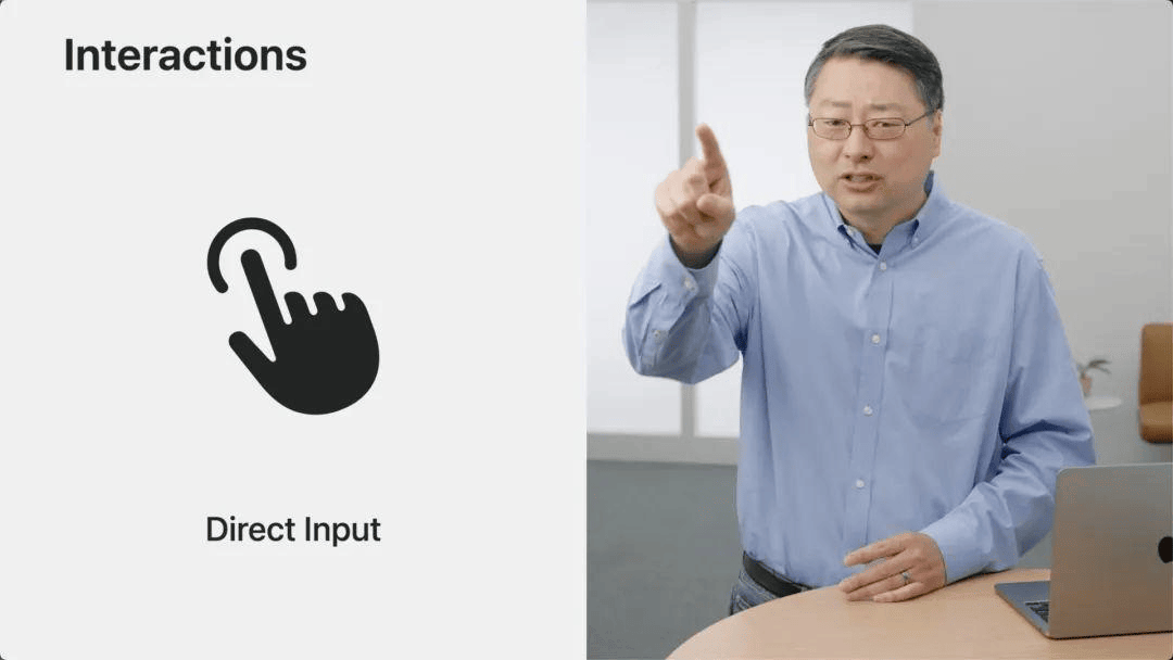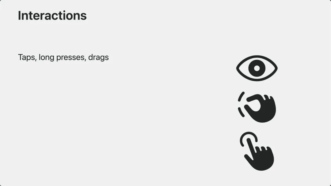 当我们的交互,从一个平面迁移到一个立体空间时,必然会带来一些方式的延展。对于如何操作一个立体空间的系统,Apple 定义了下面几种公共的交互: