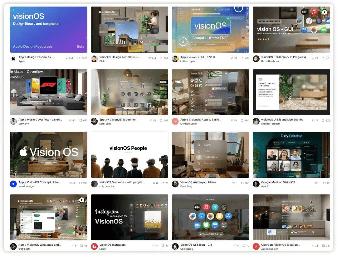 除此之外,在 Figma Community 中搜索 visionOS,你已经能够看到有相当多的设计师们开始发挥自己的“超能力”构建美轮美奂的 visionOS App 的概念稿了,基本上完成度都很高(就差一个开发了)